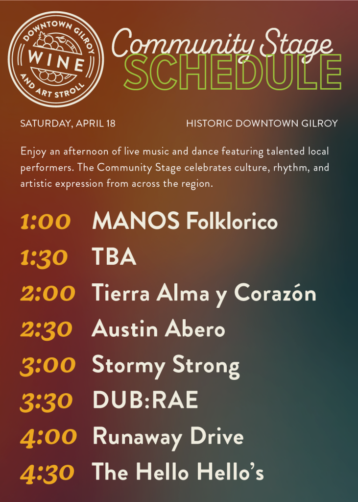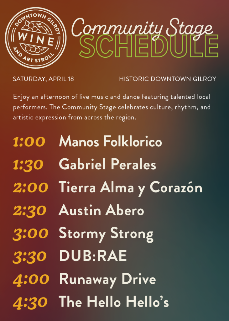Talented musicians and entertainers are lined up to provide the perfect ambiance to sip & stroll in Downtown Gilroy. Join us for a beautiful weekend!